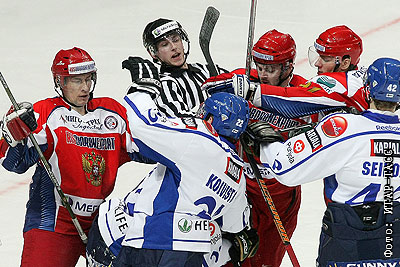 Игроки сборных России Константин Горовиков, Александр Радулов, Олег Сапрыкин (слева направо в красной форме) и Финляндии Тони Койвисто, Маркус Сейкола (слева направо в белой форме) в матче второго этапа Еврохоккейтура "Кубок Первого канала" Россия - Финляндия.
