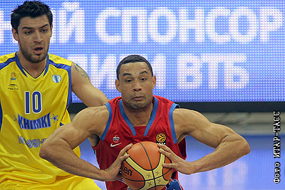 Игроки "Химок" Карлос Дельфино и ЦСКА Траджан Ленгдон (слева направо) в матче чемпионата Кубка Единой лиги ВТБ: ЦСКА – "Химки" - 70:66