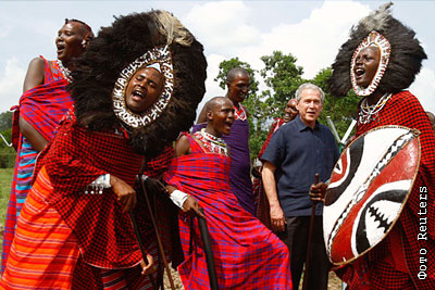 Президент США Джордж Буш на ритуальном представлении в племени массаев