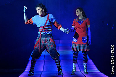 Солисты Мюзик-Холла Денис Дэмкив (в роли Кая) и Елена Васильева (в роли Герды) на предпремьерном прогоне мюзикла "Нежная королева" композитора Романа Игнатьева на сцене Мюзик-Холла