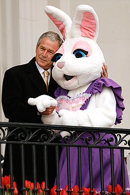 Джордж Буш обнимает Пасхального кролика на крыльце Белого дома