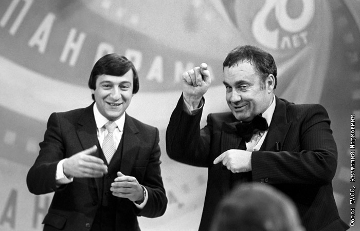 Геннадий Хазанов (слева) и Эльдар Рязанов во время записи передачи "Кинопанорама". Декабрь 1982 года.