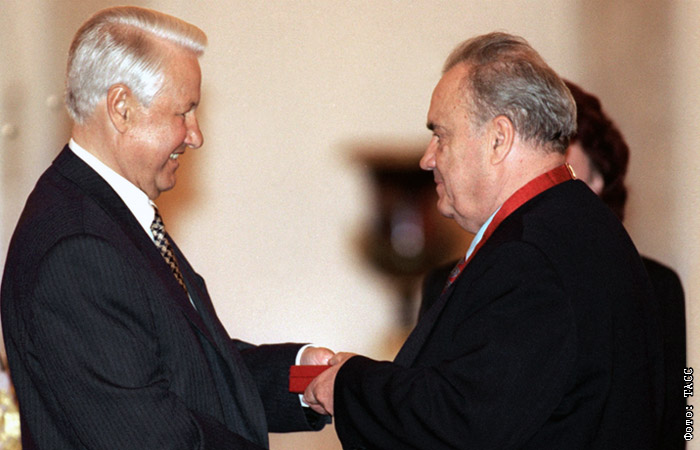Президент РФ Борис Ельцин вручает Эльдару Рязанову орден "За заслуги перед Отечеством" за многолетнюю плодотворную деятельность в области культуры. Май 1997 года.