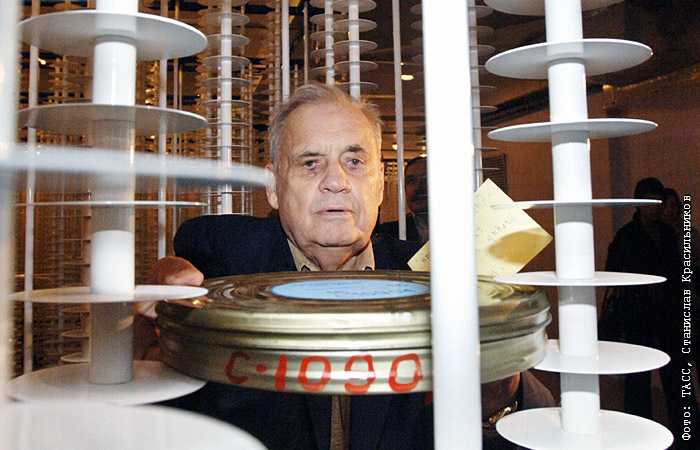 Эльдар Рязанов во время переноса своих фильмов в новое здание фильмохранилища Госфильмофонда в Белых столбах. Октябрь 2008 года.