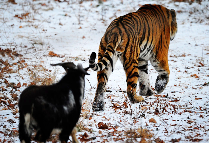 Тигр Амур и козел Тимур продолжают жить в одном вольере Приморского сафари-парка. Более двух недель назад тигр подружился с козлом, которого ему прислали в качестве добычи. Амур козла трогать не стал, поскольку тот оказался очень смелым. Сотрудники сафари-парка назвали козла Тимуром за его бесстрашие. Днем Амур и Тимур выходят гулять вместе по большому вольеру. Козел принял тигра за своего вожака и всюду следует за ним. Кроме того, тигр Амур начал давать приятелю уроки охоты.