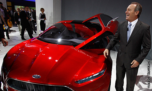 Исполнительный директор европейского подразделения концерна Ford Стивен Оделл на 64-м Международном автосалоне во Франкфурте представил новый концепт-кар Ford Evos.