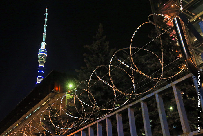 Здание московского телецентра "Останкино" из соображений безопасности обнесли колючей проволокой.