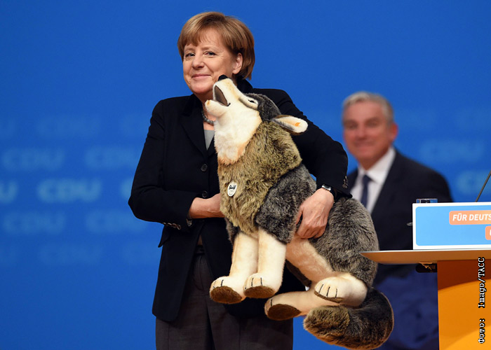 На съезде правящего Христианско-демократического союза в Карлсруэ Ангеле Меркель подарили плюшевого воющего волка
