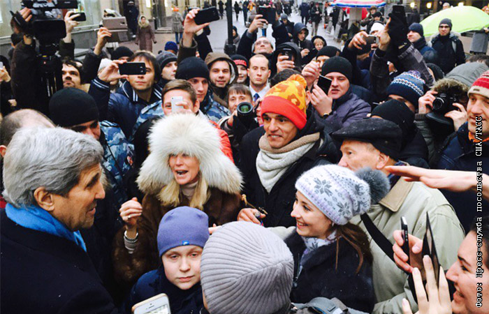 В ходе рабочего визита в Москву госсекретарь США Джон Керри пообщался с жителями столицы и зашел за подарками в один из магазинов на Старом Арбате.