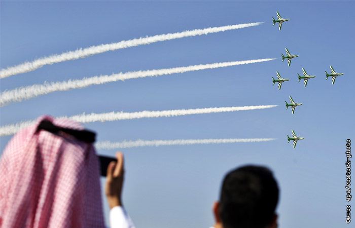 Посетители международного чемпионата по воздушному спорту смотрят на выступление пилотажной группы "Саудовские Ястребы"