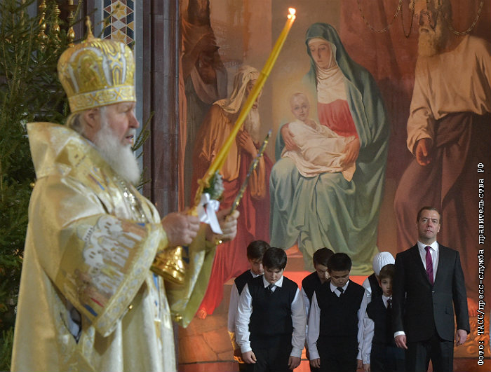 Патриарх Московский и всея Руси Кирилл (слева) и премьер-министр РФ Дмитрий Медведев (справа на втором плане) во время праздничного богослужения по случаю Рождества Христова в храме Христа Спасителя в Москве