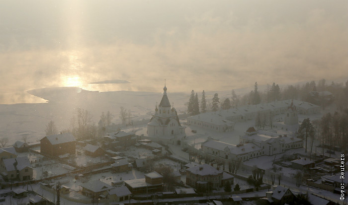 Рождественское утро Успенском мужском монастыре, расположенном в Красноярске в на берегу Енисея