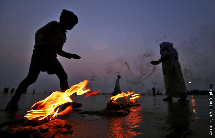 В Индии паломники со всей страны прибывают на остров Сагар, чтобы совершить ритуал омовения в Ганге или других священных реках и вознести молитвы после купания во время праздника Макара-санкранти
