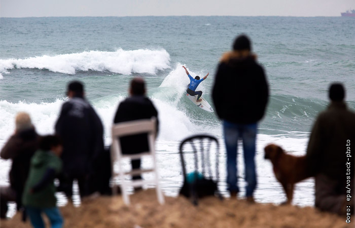 В израильском городе Нетания десятки спортсменов соревнуются на волнах Средиземного моря во время Чемпионата мира по серфингу