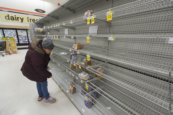 Покупатель перед пустыми полками супермаркета в городе Александрия, штат Виргиния. Жители восточного побережья США запасаются продуктами и товарами первой необходимости в преддверии снежной бури.