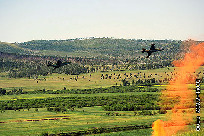 Налет авиации "противника" на построенный мост во время практических действий в рамках оперативно-стратегических учений "Восток - 2010" на полигоне вблизи поселка Могойтуй
