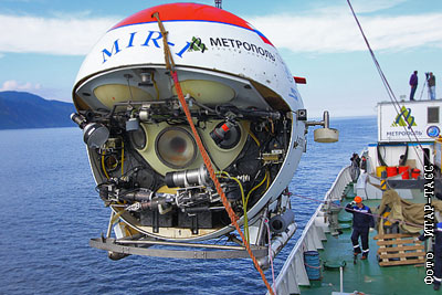 Погрузка из воды глубоководного аппарата "Мир-1", который опускался на дно озера Байкал