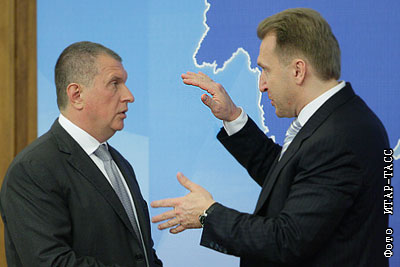 Вице-премьер РФ Игорь Сечин и первый вице-премьер РФ Игорь Шувалов (слева направо) перед началом совещания по вопросам социально-экономического развития Дальнего Востока и укрепления позиций России в Азиатско-Тихоокеанском регионе, которое провел президент России Дмитрий Медведев