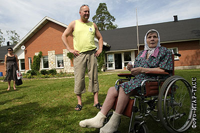 Дочь И. Антоновой Наталья Кяярик (слева) с супругом Ари Лайтоненом и 82-летняя россиянка Ирина Антонова (справа), которой финские власти отказали в предоставлении вида на жительство, у интерната для престарелых в поселке Кикерино