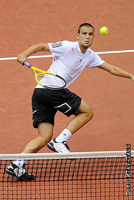 Россиянин Михаил Южный в матче 1/4 финала теннисного турнира "Кубок Дэвиса", в котором он проиграл аргентинцу Д. Налбандяну со счетом 6:7, 4:6, 3:6