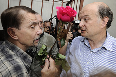 Глава движения "За права человека" Лев Пономарев и экс-директор музея и общественного центра им. Сахарова Юрий Самодуров (слева направо), признанный виновным в разжигании национальной розни за организацию выставки "Запретное искусство-2006" и приговоренный к штрафу в 200 тысяч рублей, в Таганском суде