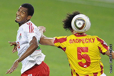 Игроки "Локомотива" Маркес Майкон и "Алании" Джордже Флореску (слева направо) в матче чемпионата России по футболу: "Локомотив" (Москва) - "Алания" (Владикавказ) – 3:0