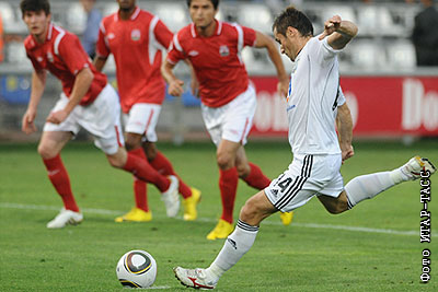 Игрок "Сатурна" Дмитрий Кириченко (на первом плане) в матче чемпионата России по футболу: "Сатурн" (Московская область) - "Спартак" (Нальчик)