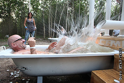 Художник Олег Кулик у инсталляции "Путь воды" работы Марины Звягинцевой на фестивале ландшафтных объектов "Архстояние - 2010": "Девять Ключей лабиринта. Лесная литургия"
