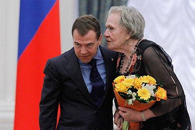 Президент России Дмитрий Медведев и актриса Римма Маркова, награжденная орденом "За заслуги перед Отечеством" IV степени, на церемонии вручения государственных наград в Екатерининском зале Кремля