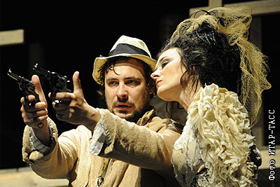 Актеры Наталия Попова (Елена Ивановна Попова) и Евгений Цыганов (Григорий Степанович Смирнов) в сцене из спектакля режиссера Евгения Каменковича "После занавеса" на пресс-показе в театре "Мастерская Петра Фоменко"