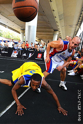 Игрок сборной России Михаил Гюнтер (справа) во время матча против сборной Швеции на чемпионате мира по уличному баскетболу "Moscow Open-2010"