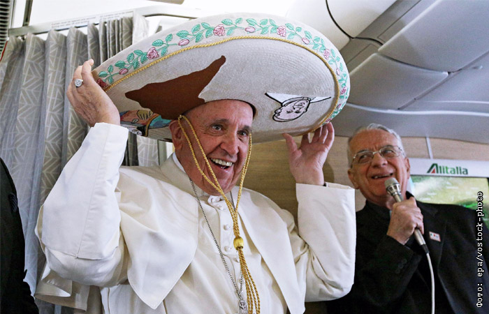 Глава Римско-католической церкви Франциск отправился в зарубежную поездку, в ходе которой на Кубе он впервые в истории встретится с Патриархом Московским и всея Руси Кириллом, а затем отправится в Мексику. По пути Папа Римский Франциск успел примерить подарок мексиканского журналиста - сомбреро.
