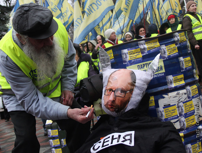 В Киеве прошел митинг за отставку Арсения Яценюка у здания Верховной рады, где премьер представил годовой отчет о работе правительства Украины.