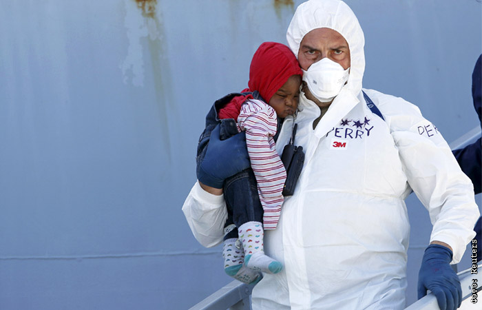 В сицилийском порту Аугуста корабли военно-морских сил Италии высадили на берег более 700 мигрантов, спасенных в ходе патрулирования Тунисского пролива
