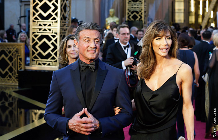 Претендент на "Оскар" за лучшую роль второго плана актер Сильвестр Сталлоне с женой Дженифер Флавин