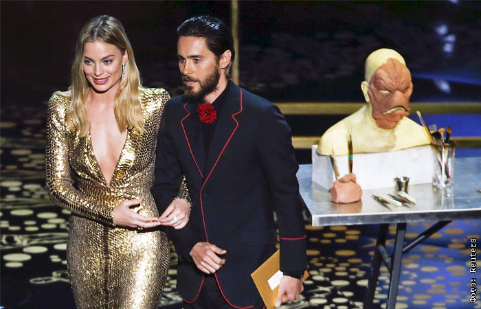 Актриса Марго Робби и певец Джаред Лето во время вручения премии "Оскар" за лучший грим