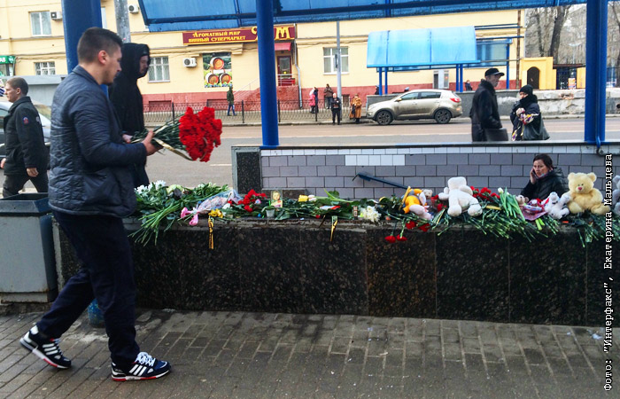 Москвичи несут цветы к станции метро "Октябрьское поле"