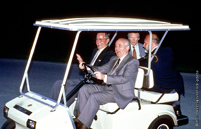 Президент США Джордж Буш (слева) и Михаил Горбачев, который пытается совладать с каром для гольфа в "Кэмп Дэвид", где проходили летние переговоры в июне 1990 года