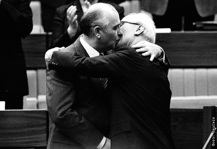 Исторический поцелуй между генсеком КПСС Михиалом Горбачевым и лидером ГДР и СЕПГ Эрихом Хонеккером после его переизбрания на пост генерального секретаря Конгресса Коммунистической партии в апреле 1986 года