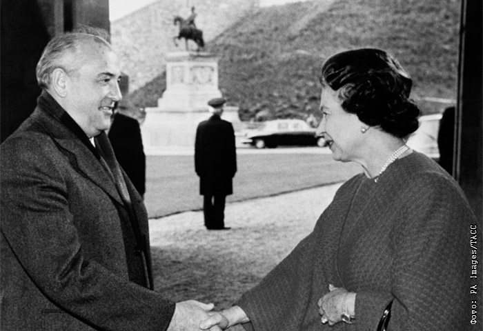 Президент СССР Михаил Горбачев приветствует королеву Елизавету II у входа в Виндзорский замок в апреле 1989 года