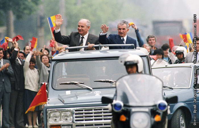 Генеральный секретарь ЦК КПСС Михаил Горбачев (слева) и Президент Румынии Николае Чаушеску в Бухаресте в мае 1987 года