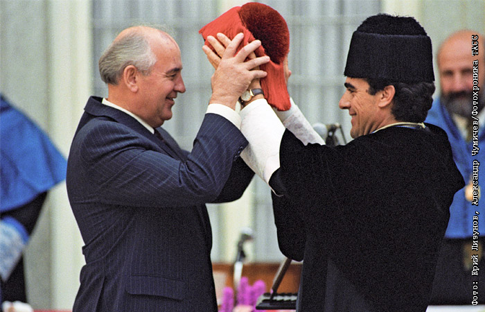Торжественная церемония присвоения звания почетного доктора Мадридского университета и университета Комплутенсе президенту СССР Михаилу Горбачеву во дворце Пардо в Испании в октябре 1990 года
