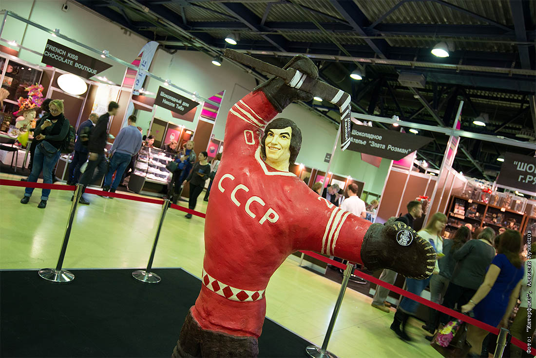 В Москве проходит пятый Шоколадный салон. Среди экспонатов - шоколадный Вячеслав Третьяк в натуральную величину, в программе - показ платьев из шоколада.