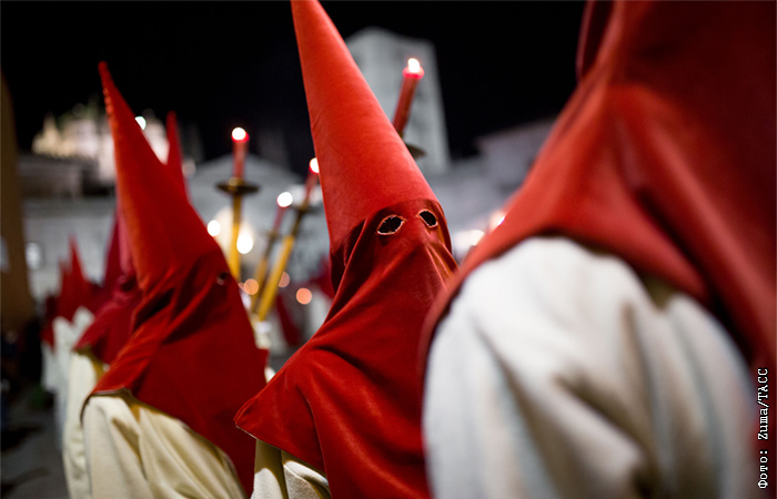 Кающиеся грешники из братства "Cristo de las Injurias" принимают участие в религиозном шествии в Саморе, Испания