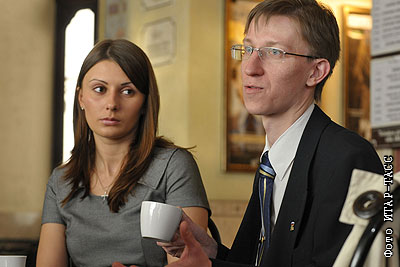 Главный редактор журнала "Россия Единая" Вера Путина и председатель Молодежного совета Санкт-Петербурга Дмитрий Грызлов перед началом Всероссийской акции "Почта Победы" в кинотеатре "Аврора"