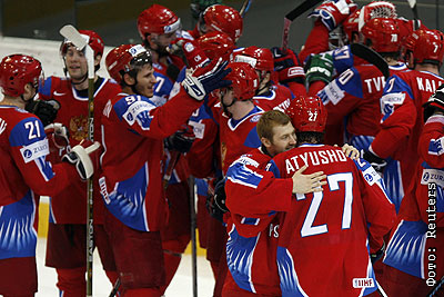 Игроки сборной России по хоккею празднуют победу над командой США в полуфинальном матче Чемпионата мира
