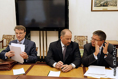Глава Сбербанка РФ Герман Греф, председатель правления Внешэкономбанка Владимир Дмитриев и первый заместитель председателя Центробанка РФ Алексей Улюкаев (слева направо) в Кремле на совещании по вопросам развития банковской системы