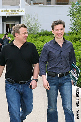 Главный тренер сборной России Вячеслав Быков и его помощник Игорь Захаркин (справа налево) после пресс-конференции, посвященной подписанию ими контракта с командой "Салават Юлаев"