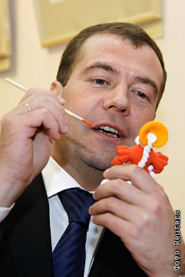 Президент России Дмитрий Медведев расписал традиционную дымковскую игрушку "Барыня" во время посещения Кировского областного художественного музея имени Виктора и Аполлинария Васнецовых