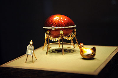 Пасхальное яйцо "Курочка", принадлежащее семье Кельх, представлено на выставке "Эпоха Фаберже" в ГМИИ им. А.С. Пушкина